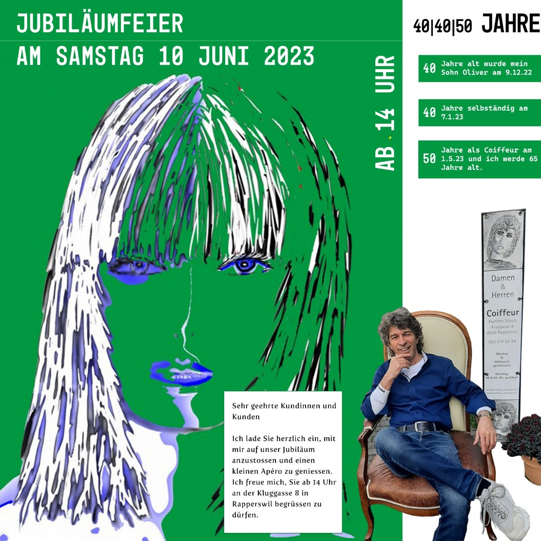 Liebe Kundinnen und Kunden, ich möchte mich von Herzen bei Ihnen für das wundervolle Jubiläumsfest am 10. Juni 2023 bedanken! Es war ein unvergessliches Erlebnis für mich und mein Team. Die Atmosphäre war unglaublich und die Freude, die Sie uns bereitet haben, ist nicht in Worte zu fassen. Ich bin stolz, seit 40 Jahren Ihr Coiffeur des Vertrauens zu sein und freuen uns auf viele weitere Jahre mit Ihnen. Vielen Dank für Ihre Treue und Unterstützung!